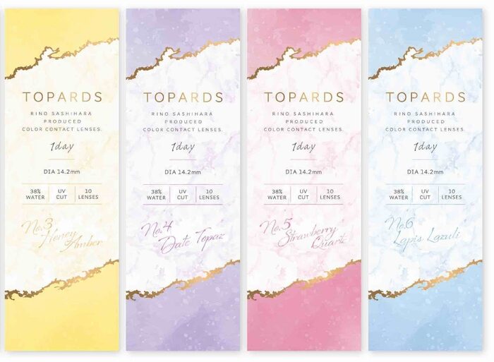 商品名『TOPARDS』は、イエロー・オレンジ・ピンク・ブルーなど様々なカラーを持つ宝石のトパーズ(英文表記:TOPAZ)が由来で、6色のレンズそれぞれの透明感や繊細な色合いのモチーフにもなっております。また、パッケージもトパーズをイメージさせるおしゃれなデザインとなっております。