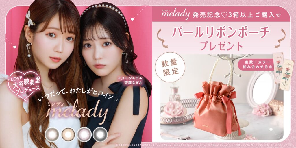 PIA株式会社(本社:東京都品川区 代表取締役:中西 聖)は、大人気アイドルグループ「=LOVE」大谷映美里プロデュース、齊藤なぎさイメージモデルのカラーコンタクトレンズブランド『melady(ミレディ)』を、本日2023年8月31日(木)より発売いたします。 また発売を記念し、『melady(ミレディ)』3箱以上購入でオリジナルパールリボンポーチがもらえるノベルティキャンペーンを実施いたします。