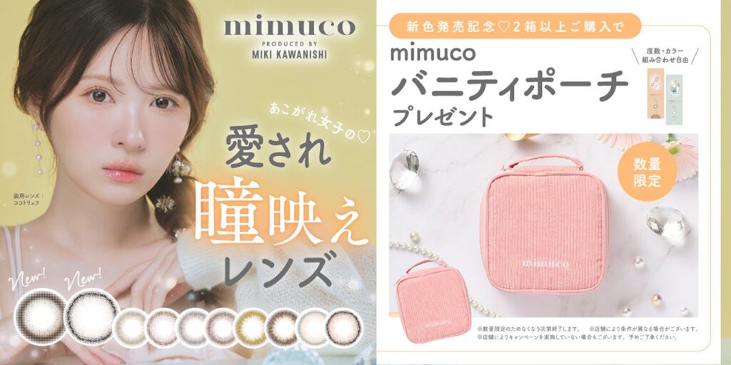 また新色発売を記念して、『mimuco(ミムコ)』を2箱以上同時購入でオリジナルバニティポーチがもらえるノベルティキャンペーンを実施いたします。