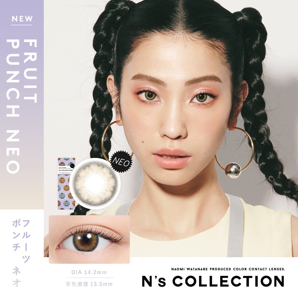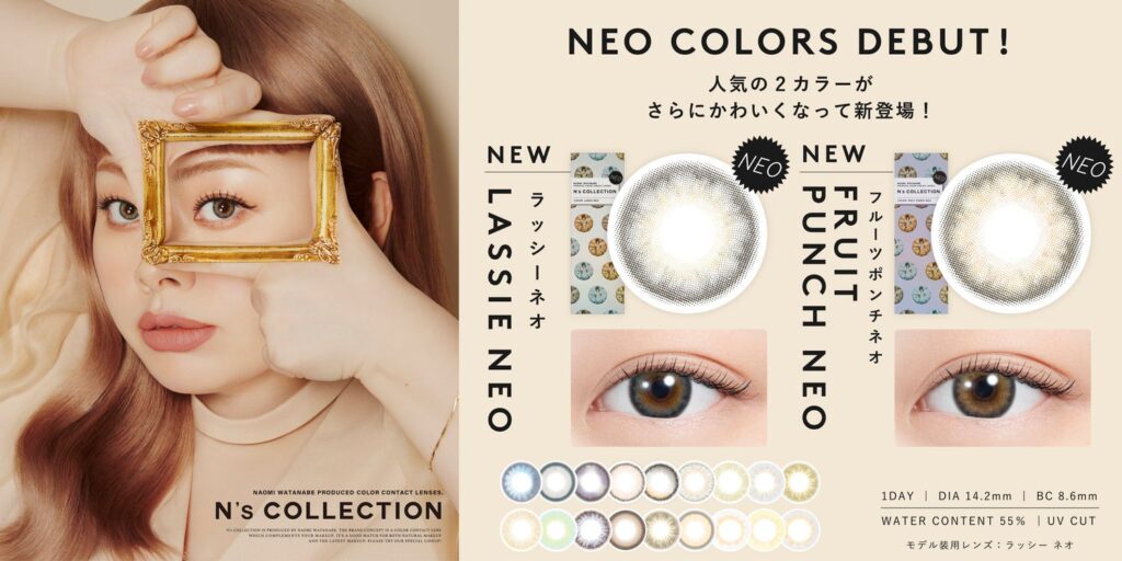 『N’s COLLECTION』待望の新色は、人気カラー「LASSIE(ラッシー)」「FRUIT PUNCH(フルーツポンチ)」が、さらに可愛く“NEO”になって新登場。『N’s COLLECTION』ならではの発色の良さはそのままに、着色直径を大きく、フチデザインを施すことでさらに盛れる仕上がりになっております。「LASSIE NEO(ラッシー ネオ)」「FRUIT PUNCH NEO(フルーツポンチ ネオ)」、どちらも『N’s COLLECTION』ファン必見のカラーラインナップです。