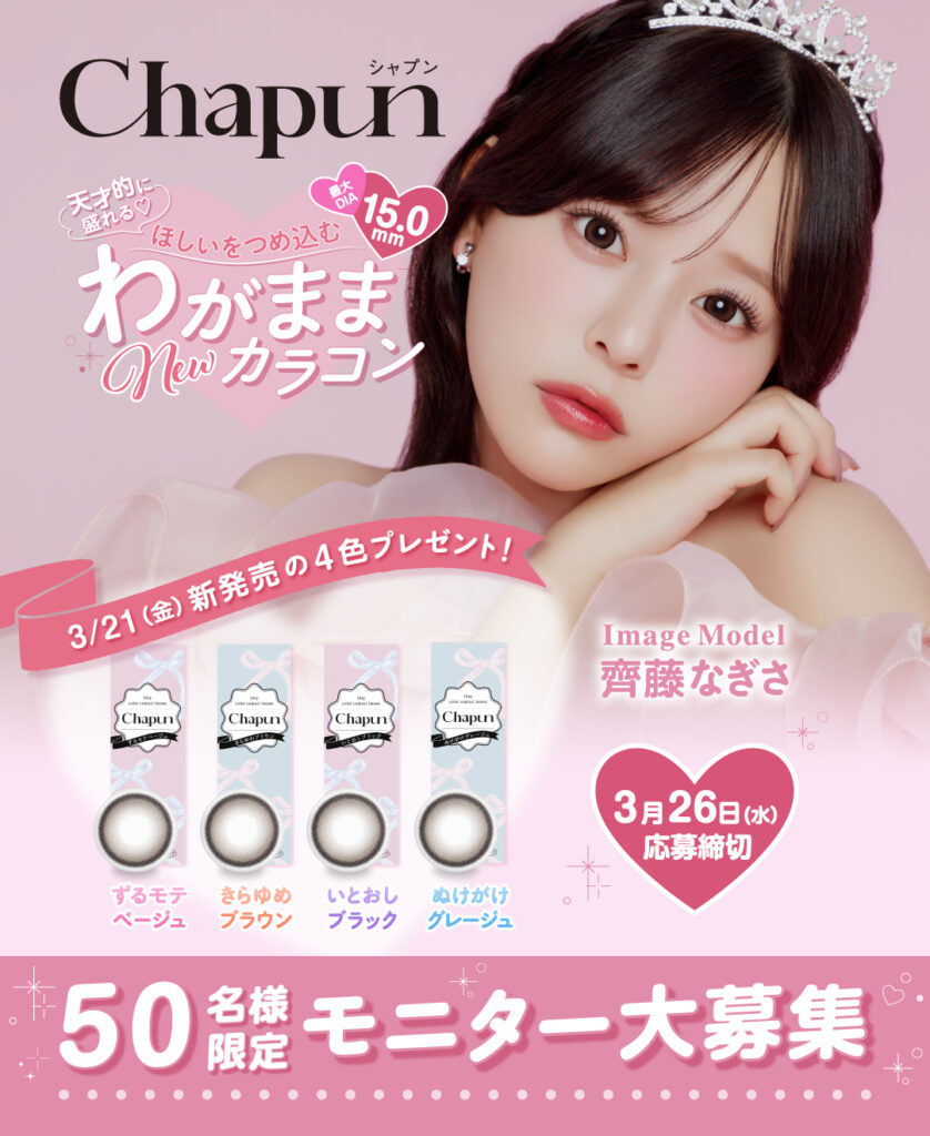 PIA株式会社(本社:東京都品川区 代表取締役:見原 博道)は、2025年3月21日(金)に映画【推しの子】出演でも話題の、齊藤なぎささんがイメージモデルを務めるカラーコンタクトブランド『Chapun(シャプン)』を発売いたします。