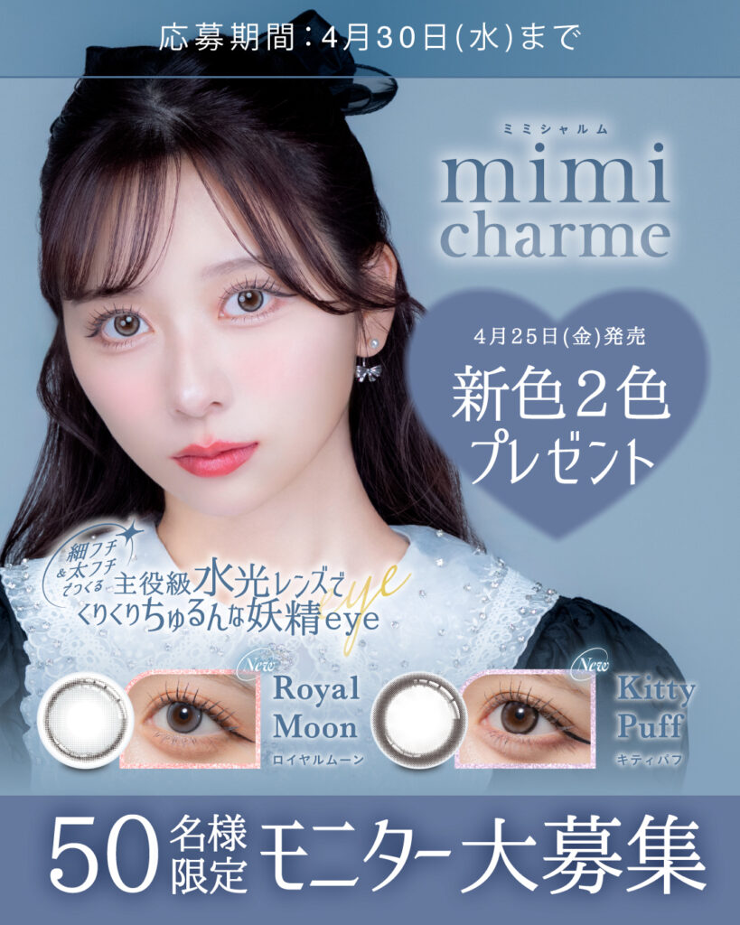 大人気カラーMoon Latte(ムーンラテ)の色違いレンズ、キラめき水光ミルキーグレーの「Royal Moon(ロイヤルムーン)」と、mimi charme(ミミシャルム)史上最大着色直径13.8mm、太フチ無敵盛れ水光グレーの「Kitty Puff(キティパフ)」の2色展開で発売いたします。