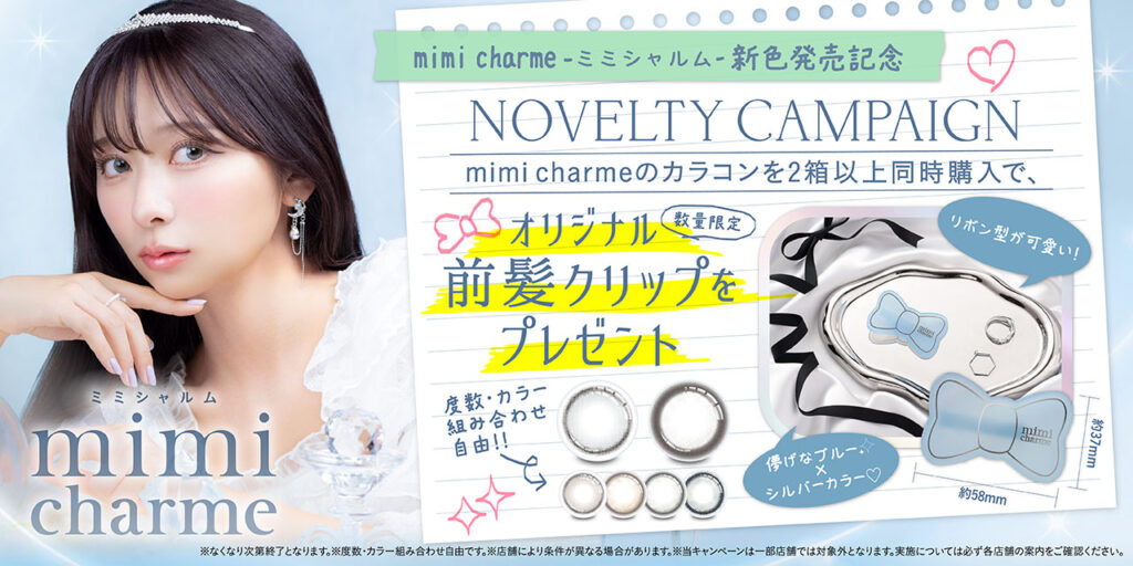 新色発売を記念し、mimi charme(ミミシャルム)のカラコンいずれかを2箱以上同時購入で、オリジナル前髪クリップをプレゼントいたします。
