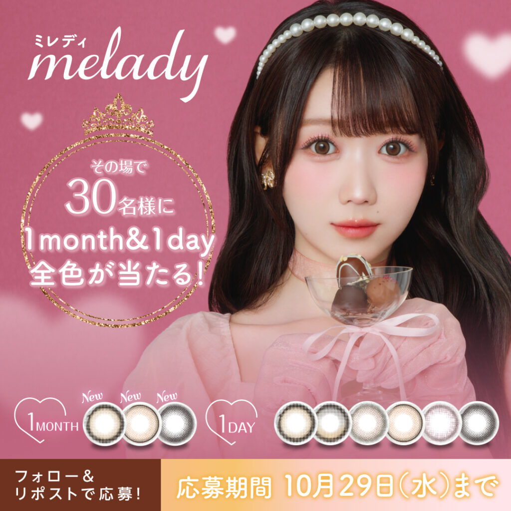 本日10月23日(木)より、melady公式Xアカウントにて抽選で30名様にmeladyマンスリー&ワンデー全色セットが当たるプレゼントキャンペーンを実施いたします。