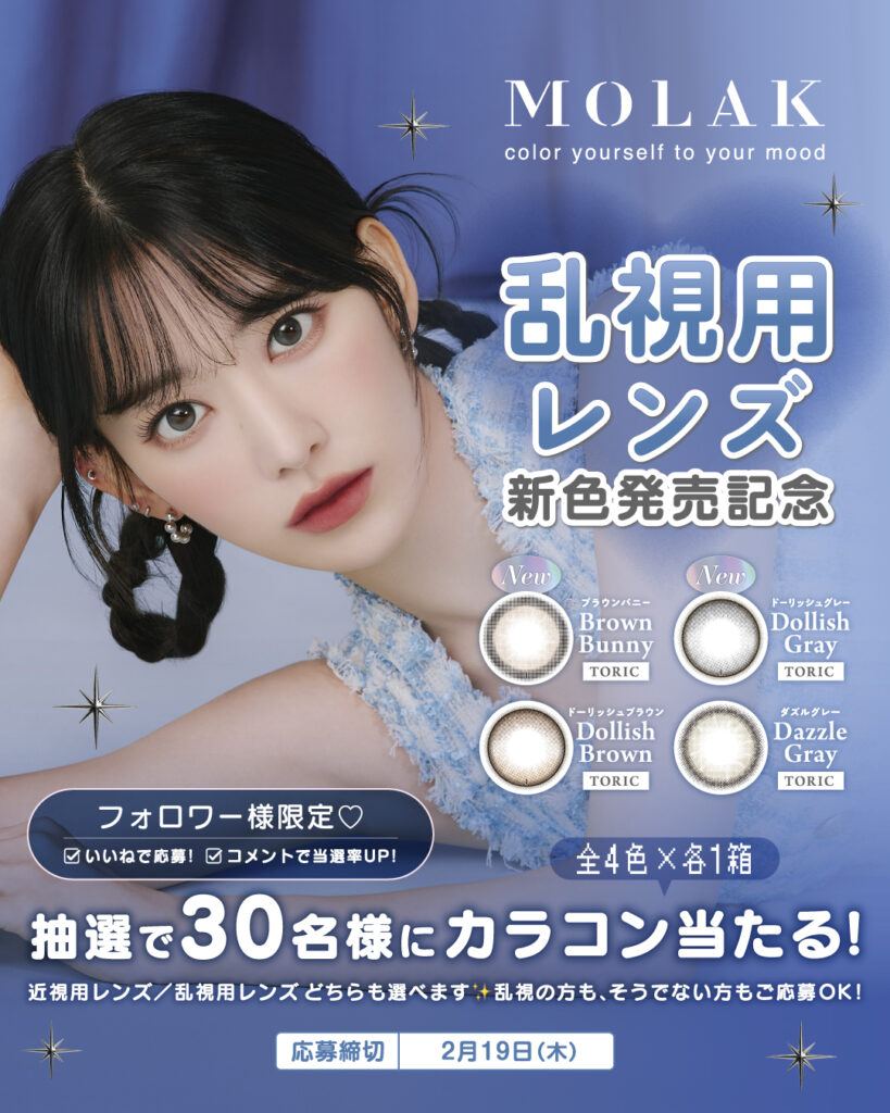 乱視用レンズ新色発売を記念して、『MOLAK(モラク)』公式Instagramにて抽選で30名様に『MOLAK(モラク)』人気カラー〈乱視展開4色〉をプレゼントするキャンペーンを実施いたします。